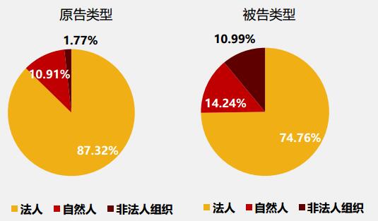 在知識產權侵權案件中,原被告均以法人為主。其中,法人占全部原告的87.32%,占全部被告的74.76%。被告中超八成法人或非法人組織的單位性質為有限責任公司。被告中超八成自然人身份為私營企業主、個體勞動者。
