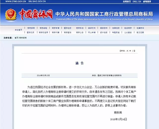 為適應(yīng)我國(guó)經(jīng)濟(jì)社會(huì)發(fā)展的新形勢(shì),進(jìn)一步優(yōu)化大眾創(chuàng)業(yè)、萬(wàn)眾創(chuàng)新的制度環(huán)境,切實(shí)服務(wù)商標(biāo)申請(qǐng)人,簡(jiǎn)化自然人辦理商標(biāo)注冊(cè)申請(qǐng)時(shí)提交的手續(xù)文件,自本通告發(fā)布之日起,我局對(duì)個(gè)體工商戶辦理商標(biāo)注冊(cè)申請(qǐng)時(shí)申報(bào)商品或服務(wù)范圍是否在其核準(zhǔn)經(jīng)營(yíng)范圍內(nèi)不再進(jìn)行審查。申請(qǐng)人持有未記載經(jīng)營(yíng)范圍信息的新版?zhèn)€體工商戶營(yíng)業(yè)執(zhí)照辦理商標(biāo)申請(qǐng)事宜的,不再提交從登記機(jī)關(guān)指定網(wǎng)站下載打印的關(guān)于經(jīng)營(yíng)范圍的證明材料。辦理轉(zhuǎn)讓商標(biāo)申請(qǐng),受讓人為自然人的,參照上述事項(xiàng)辦理。