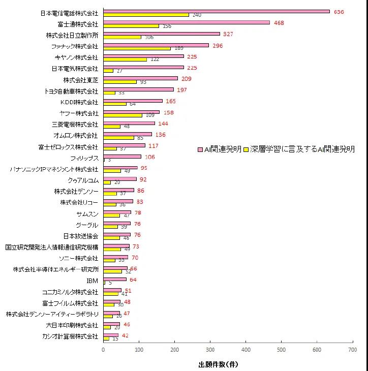 日本人工智能專利申請量 排名前三的是:日本電報電話公司(636件),富士通公司(468件),日立制作所(327件)。